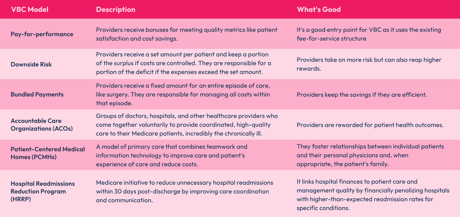 The model chosen will depend not only on the provider's risk tolerance but also on their patient population size, historical performance data, and access to technology and support services. Here are some of the models.