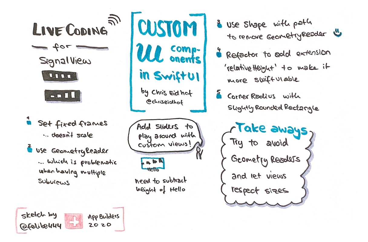 In this talk, Chris Eidhof shared some tips on how to design custom components in order to make them work like native components and respect the layout and proposed size. Tips such as avoid GeometryRender as much as possible, avoid fixed sizes, and so on. The subject was very well explained, along with an amazing step by step live coding session on how to create a custom signal view.