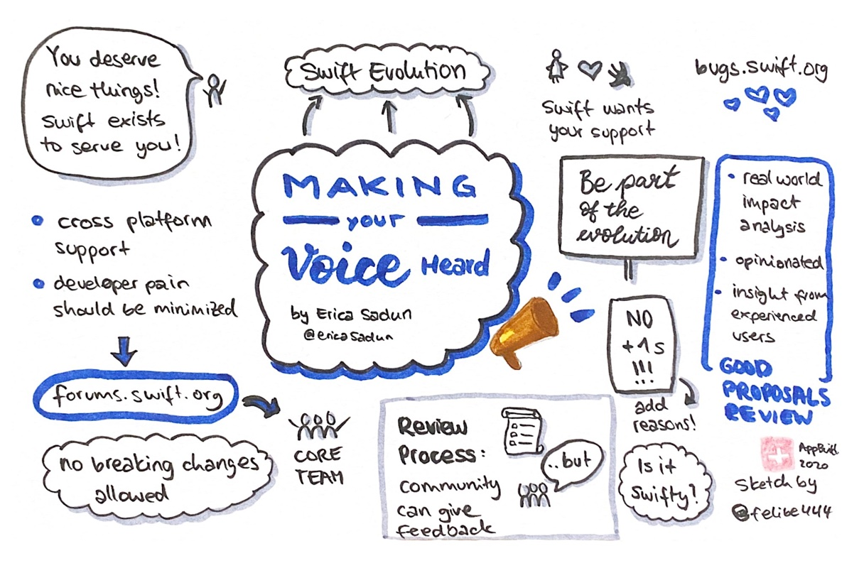 Inspiring words by Erica Sadun on how we should constantly engage with the Swift forums, posting what Swift issues we have and propose new changes. And why wouldn't we? We are the ones that are always using the damn thing, might as well make Swift work for us for a change. That's why we should be aware of the possibility to think about what changes we find important and express them to the team working on Swift year after year. So please go to https://forums.swift.org/ and be part of the evolution.