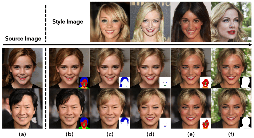 Photography editing is also much easier with segmentation. Not only its easier to separate the body from the background (hello Zoom once again), but it's also simpler to make edits to the human body. For example, if you want to edit just one aspect of the human face (eyes, lips, hair, skin color) using another image as style input (see image below).