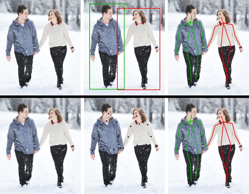 Pose estimation models face some difficulties as it primarily deals with people not only moving (and getting in and out of frame) but with different types of events that dramatically alter the appearance and position of key body points: different clothes and backgrounds, diverse lightning and several kinds of weather, motion blur in videos, defocus, visual obstructions, etc.