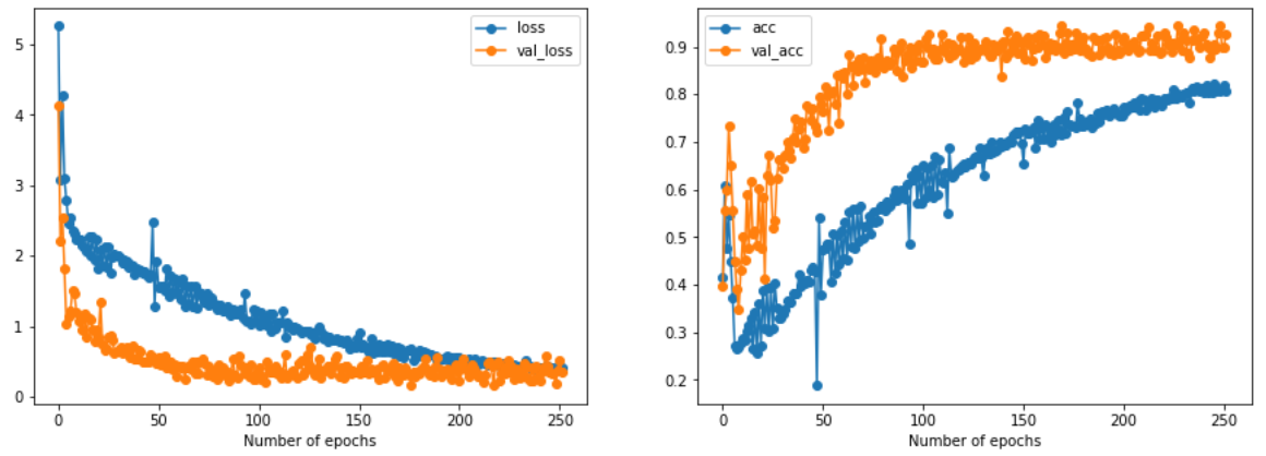 The network was trained for 250 epochs, on CPU. According to the paper, a longer training would incur overfitting, which was verified in our training. Higher accuracy in validation is attributed to the data augmentation and the generation of hard triplets.