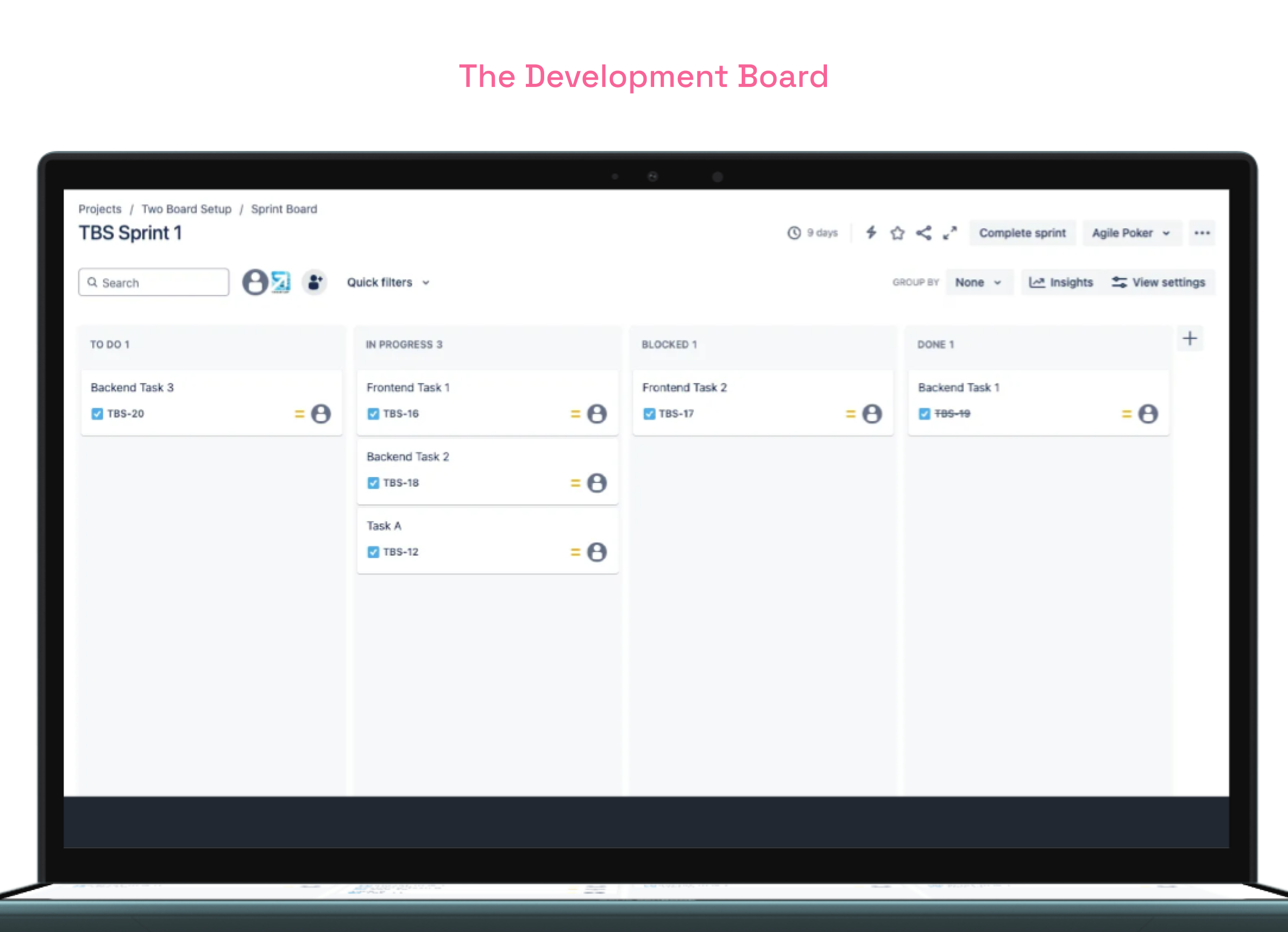 - Developers only need to interact with the Development Board on a day-to-day basis, where they see a clear breakdown of what’s expected of them in the sprint.
