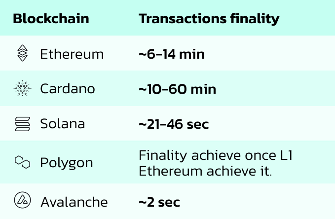 Finality guarantees that no one can alter, reverse or cancel crypto transactions once completed. Avalanche is the king with a transaction finality of fewer than two seconds in this subject.