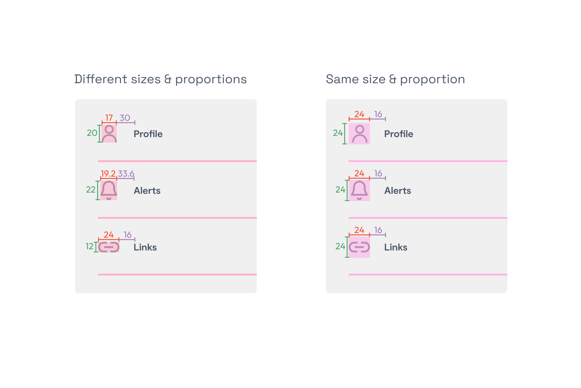 Imagine a list of tiles where every row has an icon to the left. If those icons are all different in sizes and proportions, it will be difficult for you as a designer to fit them as you wish in the tile, doing the manual work of aligning and resizing them to try to visually look all the same size. In contrast, if they have the same proportion, the work is easier as you won’t have to modify them one by one and the distances to the labels are going to be always the same.