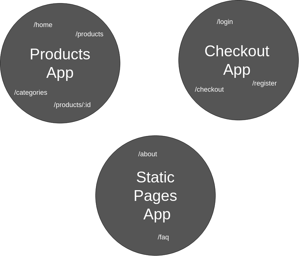 Here's a crude diagram of how our app would be split, with some examples of the URLs each will be in charge of.
